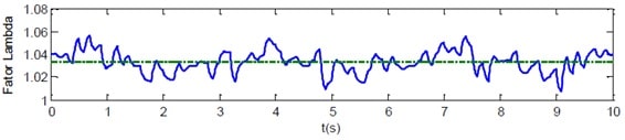 Na perturbação da massa de ar, foi introduzida uma onda senoidal, com frequência de 2 rad/s, amplitude de 1 mg e referência em 3 mg. Conforme descrito anteriormente, essa perturbação acontece devido a alguma brecha no coletor de admissão que permite uma entrada de ar no motor que não pode ser medida. A figura 5 mostra que a perturbação leva a um desvio do valor estequiométrico com média no valor 1,023.