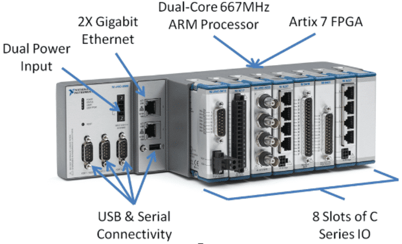 - Processador integrado programável com LabVIEW Real-Time ou C/C++, e o FPGA com o LabVIEW FPGA;