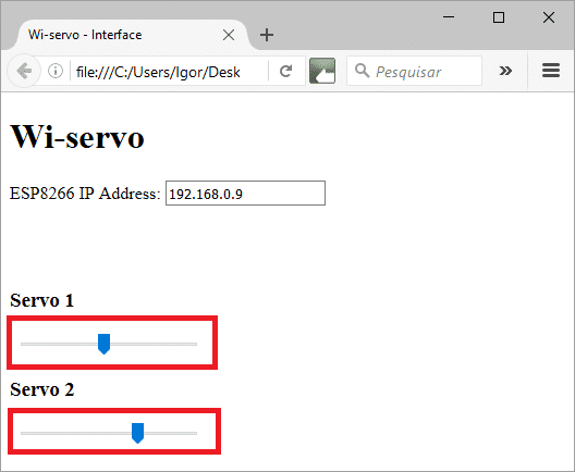 Foi projetada uma interface de controle de servomotores em HTML utilizando-se um navegador comum (Firefox por exemplo). Foram utilizados nesse tutorial dois servos, porém podem ser utilizados mais motores (esta solução foi testada com até quatro dispositivos).