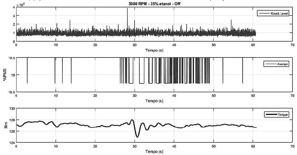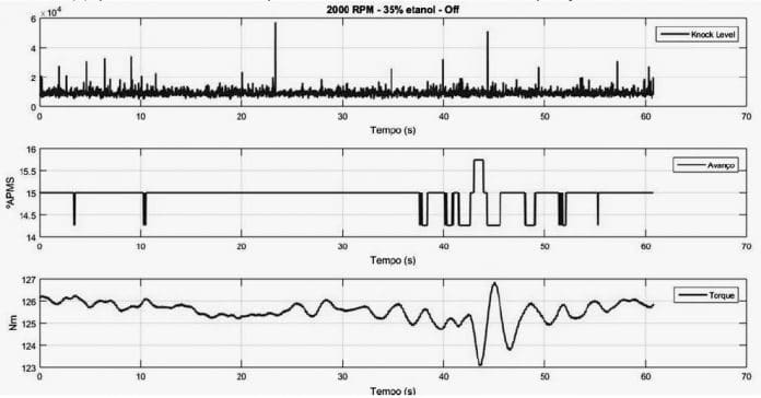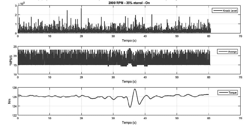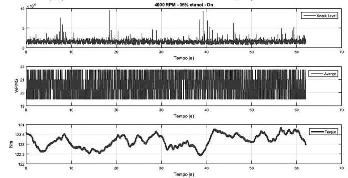 O teste apresentado nesse artigo foi realizado com as seguintes configurações: duração de 60 segundos, composição de 35% de etanol, motor com carga total e com as seguintes rotações: 2000 RPM, 3000 RPM e 4000 RPM. O teste com composição de 35% foi realizado principalmente com a intenção de se analisar e comparar o torque de saída, o torque médio, o valor do indicador de detonação e a média do indicador de detonação com o controle ativado e desativado.
