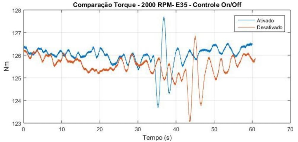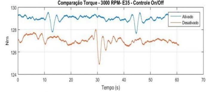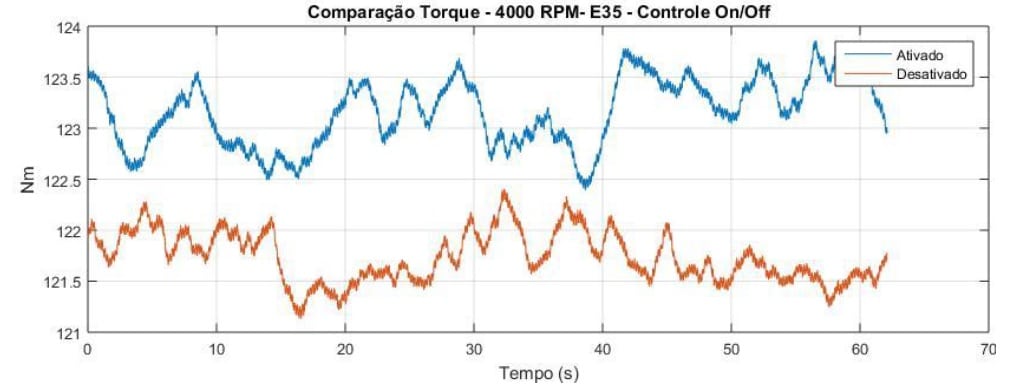 Primeiramente o principal resultado é que diferentemente do teste realizado a 2000 RPM, o teste a 3000 RPM com controle ativo apresenta ganho de torque em relação ao teste a 3000 RPM com controle desabilitado, sendo que o valor médio com controle ativo é de 129 Nm, enquanto com controle desabilitado o valor é de 127 Nm. Novamente em ambos os testes são observadas perturbações no sinal de saída de origem não medidas duas vezes, com o controle ativo a aproximadamente 12 e 45 segundos.