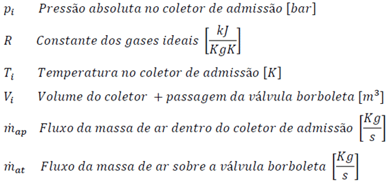 Nesse algoritmo, é utilizada a equação dos gases ideais para aproximar a relação entre a densidade do ar, a pressão do ar e a temperatura do ar no coletor de admissão. Baseando-se na equação 1, é possível deduzir que a densidade do ar admitido é proporcional à pressão absoluta do ar dentro do coletor de admissão e inversamente proporcional à temperatura do ar.