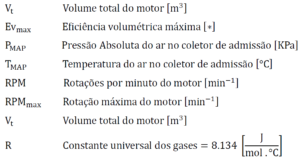 Quase todos os parâmetros desta equação são constantes e dependem de fatores construtivos do motor. Os únicos parâmetros que variam de acordo com o estado atual do motor são a pressão absoluta do ar admitido, a temperatura do ar admitido e a eficiência volumétrica. A eficiência volumétrica é definida como a massa de mistura ambiente que entra no cilindro no tempo de admissão dividida pela massa de mistura que vai preencher o espaço disponível na câmara, considerando-se a densidade do ar na admissão. A eficiência volumétrica pode ser expressa como: