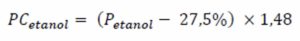 O módulo de controle utiliza essa informação para definir os parâmetros de tempo de injeção e avanço de ignição em relação aos parâmetros definidos para etanol e gasolina E27.5. O tempo de injeção final é calculado pela soma do tempo de injeção corrigido para etanol e para gasolina. O tempo de injeção corrigido para etanol é calculado como o produto entre o tempo base para etanol (Tinjeção,etanol) e pelo fator de correção da porcentagem de etanol na composição do combustível (PCetanol), onde PCetanol é dado pela subtração da porcentagem de etanol (Petanol) presente no combustível e 27,5%. O resultado é então multiplicado por um fator de correção de 1.48, conforme apresentado na equação (1). Está correção no fator tem como objetivo normalizar a leitura do sensor para a faixa de presença de etanol nos combustíveis comerciais, assumindo a gasolina E27,5 e o etanol hidratado.