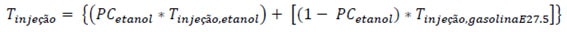 O tempo de injeção corrigido para gasolina é calculado como o produto entre o tempo de injeção base para gasolina (Tinjeção,gasolinaE27.5) e por 1 menos (PCetanol).