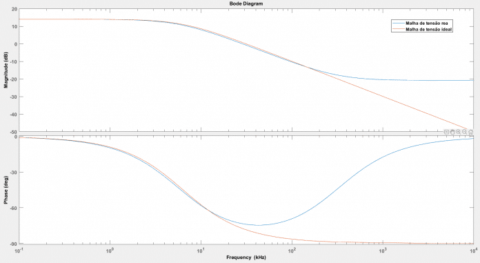 Para realizar a análise da malha de tensão é necessário uma função de transferência com ordem superior a segunda, para simplificar, analisa-se a responta em frequência em laço fechado da malha de corrente, que pode ser visualizado na Figura 14 .