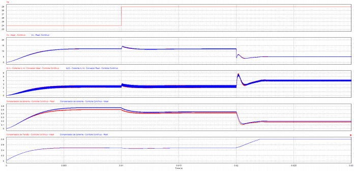 O resultado obtido no modelo discretizado pode ser visualizado na Figura 18, tensão de saída com perturbação da fonte de tensão e saída do controlador. A única alteração em relação ao circuito contínuo é o controlador.