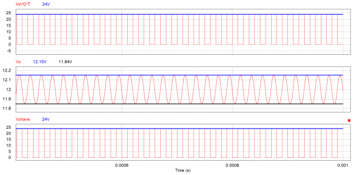 A tensão no indutor quando a chave esta fechada é , e quando está aberta,. Desta maneira, tem-se em regime:, sendo D o ciclo de trabalho (razão entre tempo de chave fechada e período de chaveamento) e T o período da frequência de chaveamento.