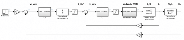 A principal malha do conversor é a de corrente no indutor L. Basicamente o ciclo de trabalho variará e assim controlará a corrente no indutor para variar a tensão na carga. Existem malhas secundárias para controlar a tensão na carga, exercendo referência para a de corrente.