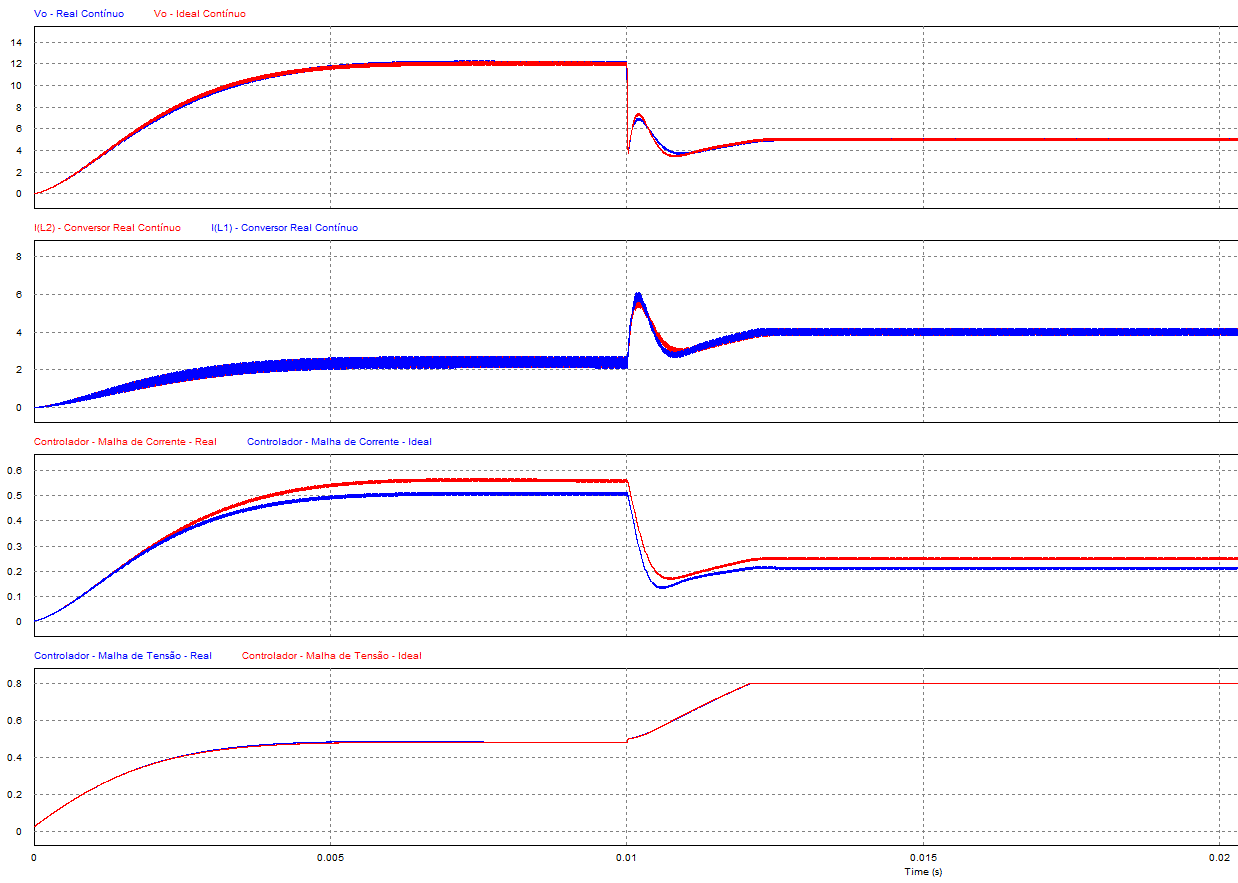 Para os modelos utilizados foi verificado que a resistência Ron e RSE, diminuem o ganho do conversor, embora utilizado um valor muitas vezes considerado alto. Em aplicações que requerem alto desempenho pode ser que exista muita diferença da planta calculada com o conversor real, pois conforme visualizado, o controlador necessita um ciclo de trabalho maior no modelo com RSE e Ron. Além do que, essas variáveis fazem com que exista queda de tensão no circuíto.