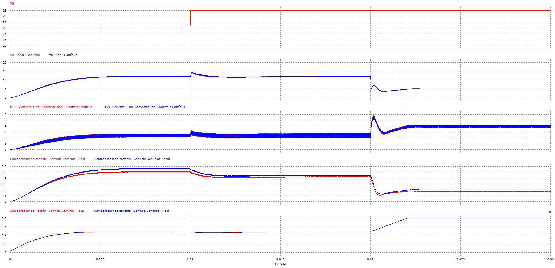 O resultado da simulação para os conversores pode ser visualizado nas Figuras 16 e 17. É verificado o comportamento em sobrecarga e também com perturbação da tensão da fonte.