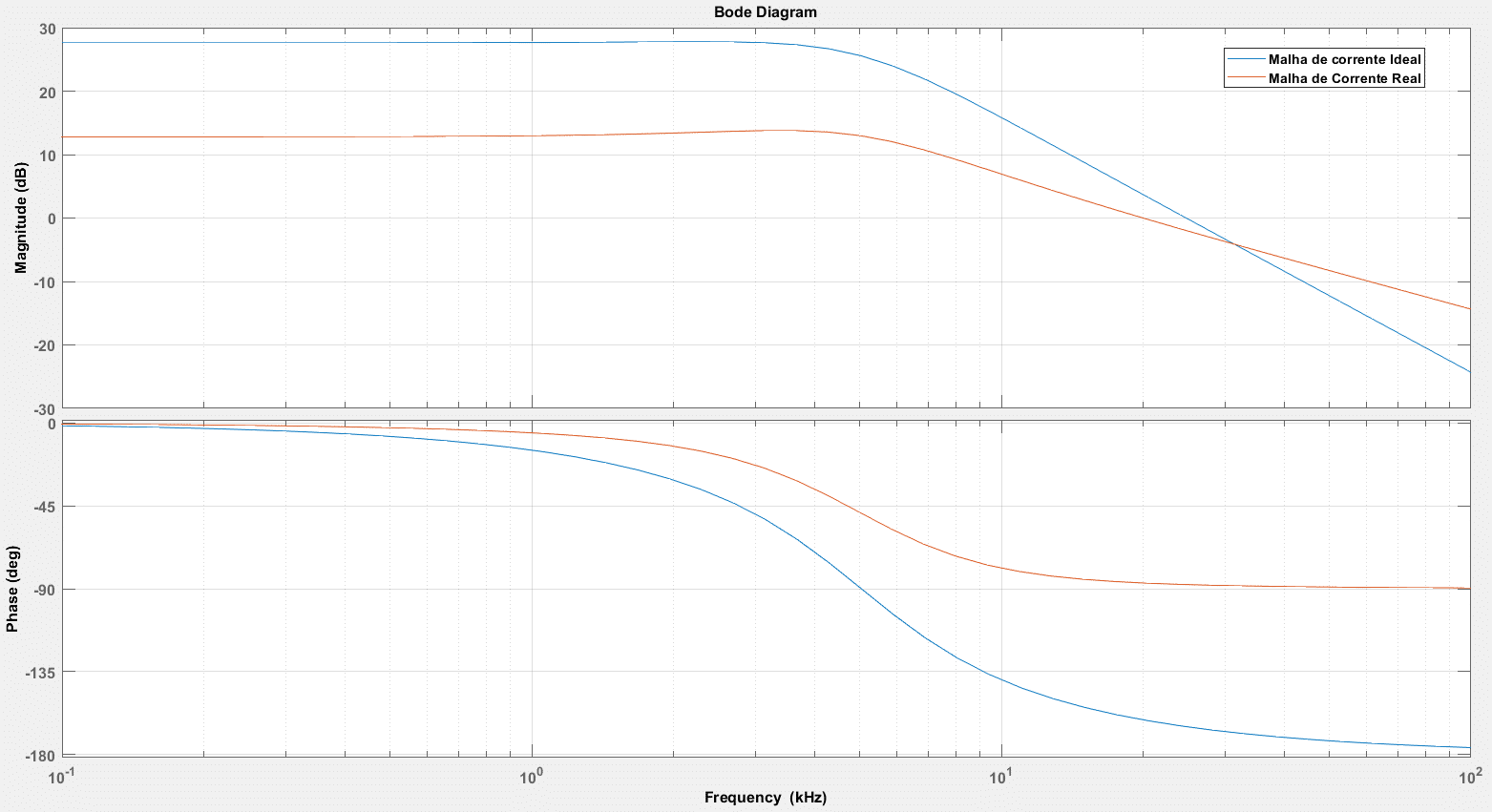 Para realizar a análise da malha de tensão é necessário uma função de transferência com ordem superior a segunda, para simplificar, analisa-se a responta em frequência em laço fechado da malha de corrente, que pode ser visualizado na Figura 14 .