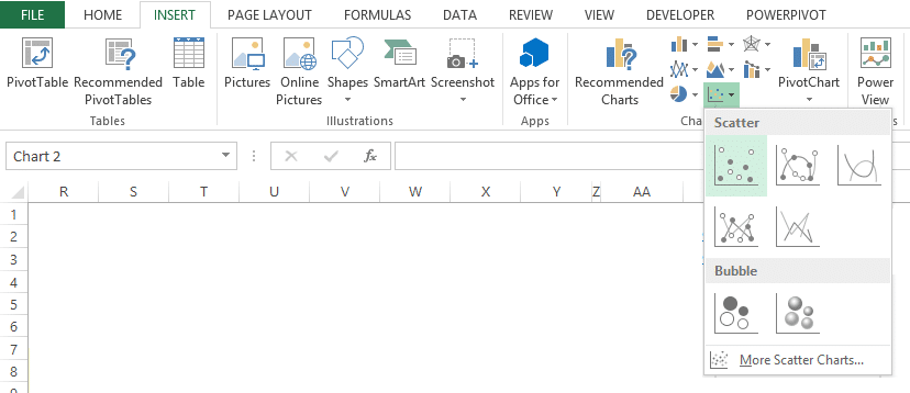 Uma das maneiras de realizar este procedimento consiste em selecionar na guia Inserir (Insert), a opção de Gráfico de dispersão (Scatter Chart).