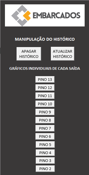 Como dito anteriormente, as informações do histórico são atualizadas sempre houver alteração no estado de uma das saídas, no entanto, percebe-se que, caso estas não sofram nenhum tipo de alteração, o histórico ficará defasado no tempo, bem como os dados dos gráficos. Portanto, uma maneira de resolver este impasse, consiste em criar um botão que adiciona apenas uma linha contendo os estados atuais das saídas tanto no histórico de dados original quando no auxiliar.