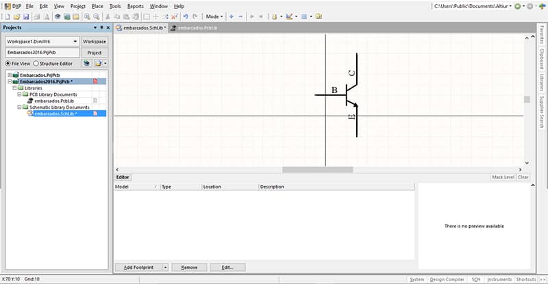 Dê um duplo clique nos pinos para entrar nas propriedades do componente. Na propriedade Display Name deixe em branco e coloque a letra referente ao pino do transistor em Designator (B – Base, C – Coletor e E – Emissor). Pronto! Temos o símbolo do transistor, agora salve e vamos criar o footprint do componente.