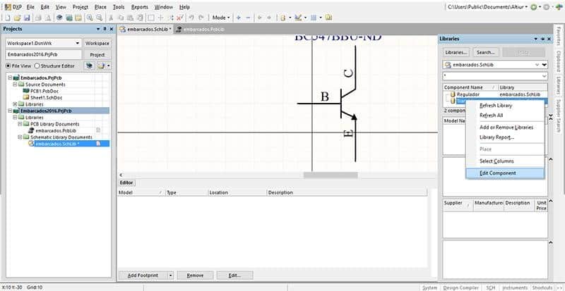 Vamos implementar esse atributo no primeiro componente que criamos, o transistor BC-547. Para isso, clicamos em System->Libraries no canto inferior direito da tela e com o botão direito clicamos no nosso componente e selecionamos Edit Component (Figura 25).