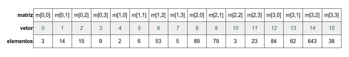 Vou indicar a matriz com a letra m e m[i,j] a posição de cada elemento na matriz: m[0,0] é o cruzamento da linha zero com a coluna zero, m[1,2] é o cruzamento da linha 1 com a coluna2, e assim por diante. Apesar de representarmos as matrizes em duas ou mais dimensões, elas na verdade são uma abstração. Toda a memória é unidimensional!!! Isso signfica que a memória de um computador de 32 bits consiste em uma matriz de bytes começando do índice (endereço) 0 x 0000 0000 e indo até o índice (endereço) 0 x ffff ffff. No entanto, muitos tipos de problemas são muito mais fáceis de resolver se pudermos não apenas pensar em termos de matrizes bidimensionais, mas também expressar nossa solução de uma forma que use diretamente os índices de linha e coluna de uma matriz bidimensional.