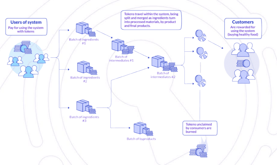 Em uma cadeia de suprimentos, o Amber acompanha o produto por toda a sua história e os clientes que compram os produtos podem restituir os tokens no final do seu ciclo, na entrega, depois da compra do produto. Esse processo de restituição do token ao sistema pode ocorrer também em um local pré-estabelecido na cadeia de suprimentos, e não exatamente no fim da cadeia de comercialização do produto. Isso então faz parte da reciclagem do token e ele volta para o início da cadeia. Além disso o produtor também recebe bônus pelo resgate do token ao final do ciclo. O Token é único e insubstituível e não há perigo de um token sobrescrever outro token, ele apenas volta pro início da cadeia e fica disponível para que outro produto possa utilizá-lo.