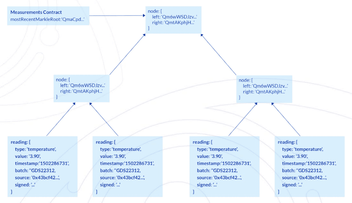 As novas medidas que chegam na rede Ambrosus são armazenadas em forma de árvore de Merkel, como folhas dessa estrutura. Para permitir uma estrutura para um sistema escalável, a Ambrosus escolheu não fazer update da árvore sempre que uma informação chega, ou seja, não escreve no Blockchain toda vez que a informação chega. A raíz da árvore é atualizada no contrato inteligente (e o processo de escrita no Blockchain é executado), por exemplo a cada 100 medidas realizadas pelos sensores autorizados pelo sistema. Ambrosus mantém todo o histórico do do que foi escrito na árvore de Merkel, para que evitar que dados sejam perdidos entre updates referentes a dados novos sendo escritos na árvore.