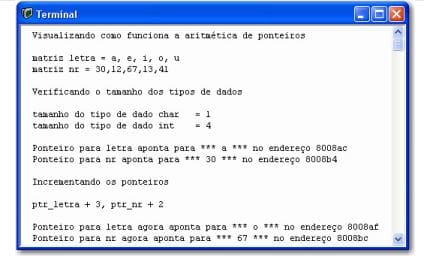 Outra aplicação muito útil é a aritmética com ponteiros. Com isto pode-se percorrer uma tabela de dados, incrementando ou decrementando os endereços da mesma, por exemplo.