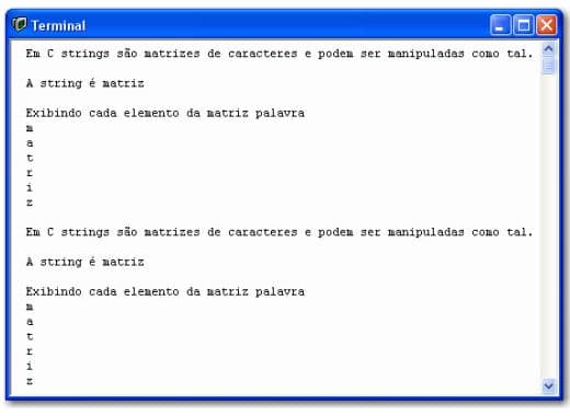 EXEMPLO 28: Modos de manipulação de elementos de uma matriz – Strings são matrizes lineares
