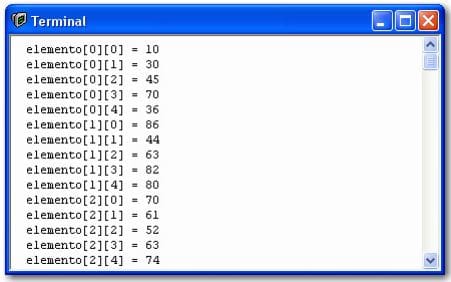 Observe que o primeiro índice ([3]) indica as linhas da matriz e o segundo ([5]) indica as colunas. Como sabemos que [3] varia de zero a 2 e [5] varia de zero a 4, fica fácil determinar os índices de cada posição da matriz: