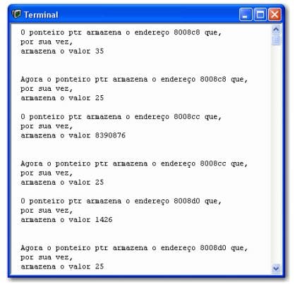 Outra utilização excelente dos ponteiros é o caso de ponteiros para ponteiros, como mostrado no EXEMPLO 25, que quando for executado gerará as seguintes mensagens no TERMINAL IO:
