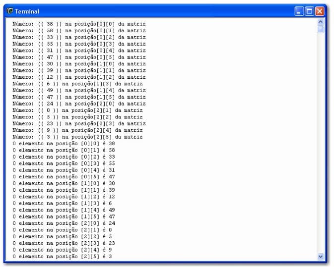 Podemos manipular os elementos de nossa matriz bidimensional usando duas variáveis e um laço for da mesma maneira que fizemos com as matrizes comuns. Observe o código do programa (EXEMPLO 30):