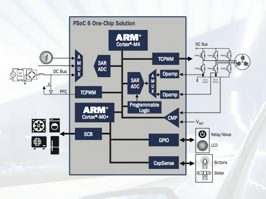 - Controle eficiente de motores: Sim algumas variantes do PSoC 6 oferecem apenas o núcleo ARM Cortex-M4, mas mais que isso, além das tradicionais pilhas de software em formatos de blocos configuráveis. As variantes para os atuadores inteligentes vão oferecer a pré-certificação funcional e segurança de classe B, fundamental para dispositivos de linha branca (equipamentos de cozinha, lavadoras, fogões):