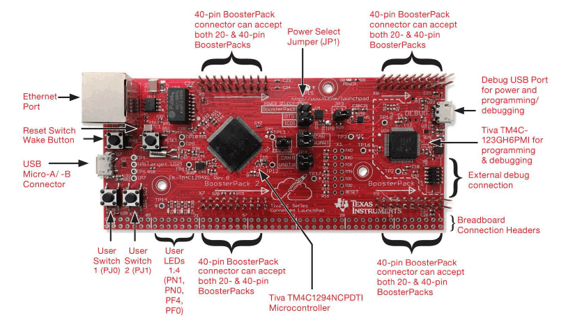 A Connected Launchpad é um kit bem interessante, veja na Figura 1. Pensado para o mercado de IoT, ele vem equipado com um microcontrolador TIVA TM4C1294, conectividade ethernet com MAC e PHY integrado, USB 2.0, 4 LEDs de uso geral, 2 chaves de uso geral e conectores para as placas de expansão Booster XL da Texas. Acabei adquirindo esta placa pois o seu preço é extremamente baixo.
