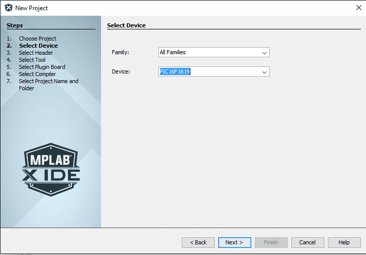 Escolher a categoria Microchip Embedded e Standalone Project. Clicando em Next, será exibida a janela a seguir. Selecione na lista o PIC16F1619, microcontrolador presente na placa Curiosity: