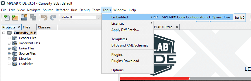 Para auxiliar na configuração do microcontrolador e seus periféricos, vamos utilizar o MPLAB Code Configurator. Para abri-lo, acesse Tool->Embedded->MPLAB Code Configurator: