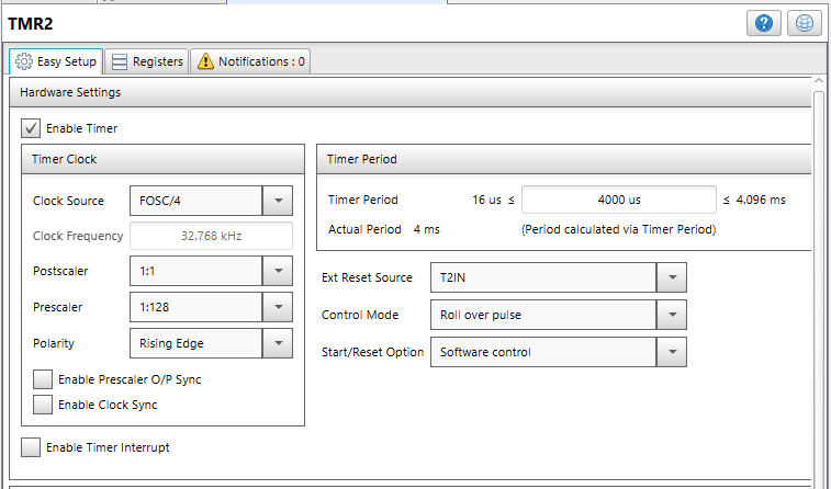 Após a seleção do TMR2, fazer a seguinte configuração para o módulo do TMR2: