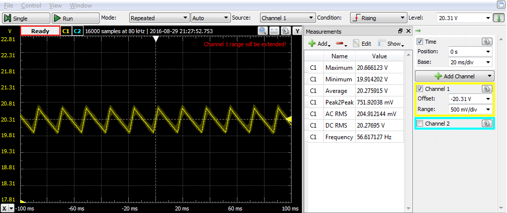 Essa abordagem trouxe um pequeno problema para ser resolvido, o ripple na tensão fornecida pelo DC/DC. Com uma tensão média de 20,31 V existe um ripple de 751 mVpp na frequência de aproximadamente 56 Hz, um valor bastante elevado, conforme a figura a seguir.