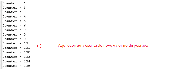Para testar também a escrita no dispositivo, note que após 10 leituras, um novo valor é enviado e então o valor do contador interno é atualizado.
