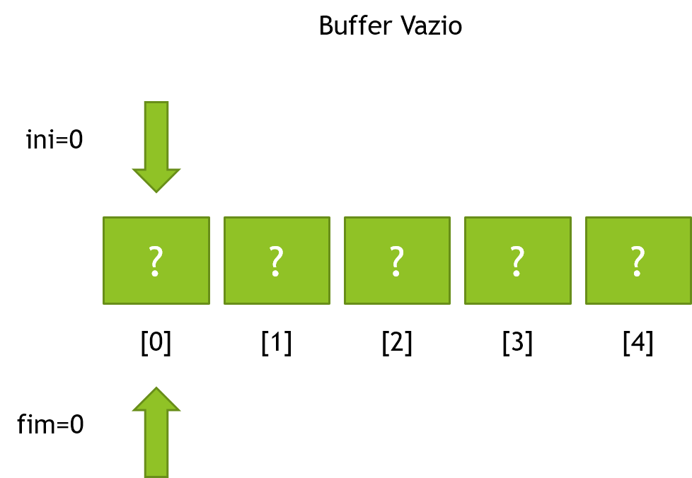 Quando o buffer estiver vazio, os índices ini e fim possuem o mesmo valor. Quando o buffer estiver cheio, o índice fim está uma posição atrás de ini.
