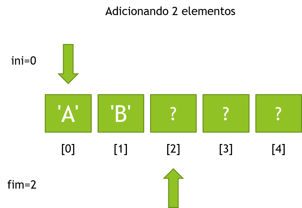 O indice fim sempre aponta para uma posição “disponível” na memória, ou seja, que pode receber um valor. Deste modo, adicionando 2 elementos no buffer temos a seguinte representação