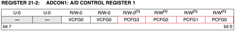O ADCON1 consiste em um registrador importante para a configuração do módulo analógico do microcontrolador PIC18F4550, uma vez que por meio dos bits PCFG0, PCFG1, PCFG2, PCFG3, serão selecionadas as respectivas portas configuradas como entradas analógicas. É disponibilizado no datasheet do componente uma tabela referente ao valor que os 4 bits devem assumir para configurar as portas analógicas.