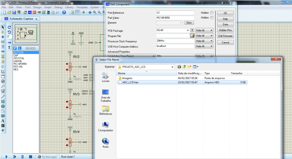 Após localizar o arquivo, devemos importá-lo para o ISIS Proteus para efetivamente realizar a simulação. Uma vez que todos os componentes se encontrem devidamente conectados conforme o diagrama fornecido, devemos clicar no microcontrolador PIC18F4550 com o botão direito do mouse, selecionar a opção “Edit Properties”, ou acessar utilizando o atalho CTRL+E.