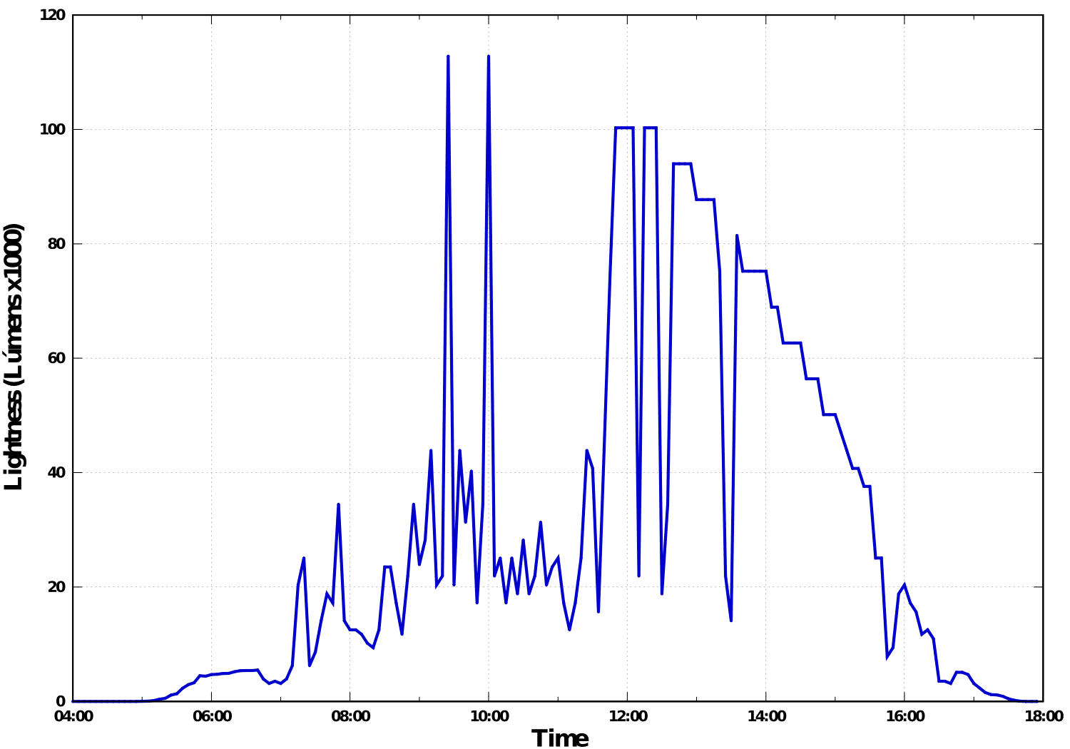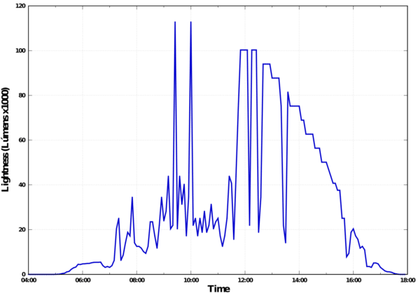 Durante a manhã, estava muito nublado, o que explica os baixos níveis de luz, enquanto à noite o sol era muito intenso, como mostra a imagem abaixo.
