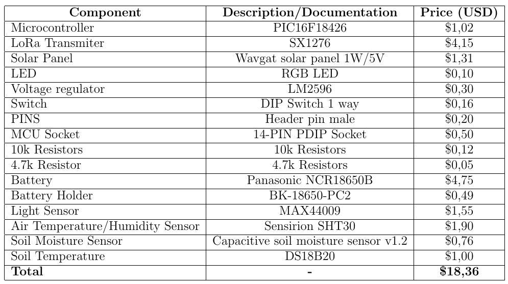 A implementação do dispositivo foi um sucesso e todos os requisitos foram atendidos. O uso do transmissor SX1276 LoRa tornou o valor final muito barato, porém foi necessário implementar todo o firmware. O módulo de alimentação usando um painel solar em conjunto com uma bateria 18650 funcionou muito bem, à noite o sistema era alimentado por bateria e durante o dia pelo painel solar, e a bateria carregou por completo durante à tarde através do painel solar. As leituras de dados do sensor se comportaram conforme o esperado, logo o dispositivo está pronto para aplicações agrícolas.