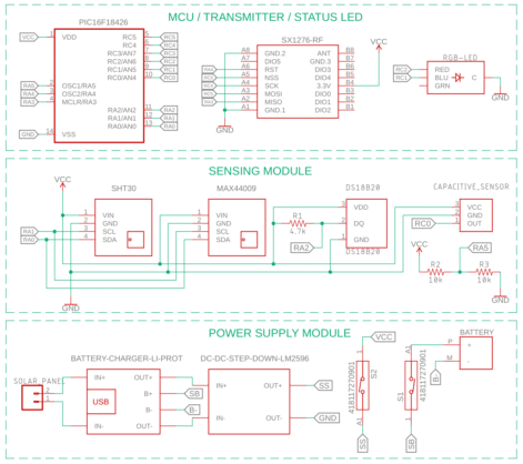 O dispositivo é capaz de ler dados como temperatura do ar e do solo, temperatura do ar, umidade do ar e do solo. Foi necessário um regulador de tensão para reduzir a tensão da bateria e do painel solar para 3,3 V. É possível usar o dispositivo por energia solar, bateria ou ambas as formas.