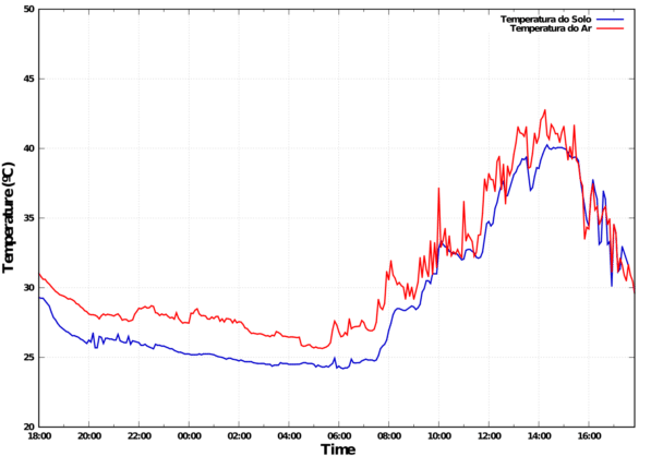 O gráfico a seguir mostra os níveis de temperatura do solo e do ar coletados pelos sensores DS18B20 e SHT30, respectivamente. Como esperado durante a tarde, as temperaturas foram mais altas, enquanto durante o amanhecer as temperaturas caíram consideravelmente.