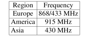 De acordo com o trabalho de Devalal and Karthikeyan (2018), o protocolo LoRa é voltado para sistemas que usam baterias e precisam transmitir pequenas quantidades de dados em intervalos curtos e a longas distâncias. Os transmissores LoRa usam faixas de frequência que podem variar por região. A tabela abaixo especifica as faixas de frequência usadas em diferentes regiões do globo.