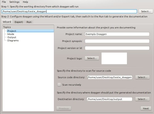 - Em Project, coloque o nome do projeto, selecione o diretório do código fonte e o diretório onde o Doxygen irá salvar a documentação;
