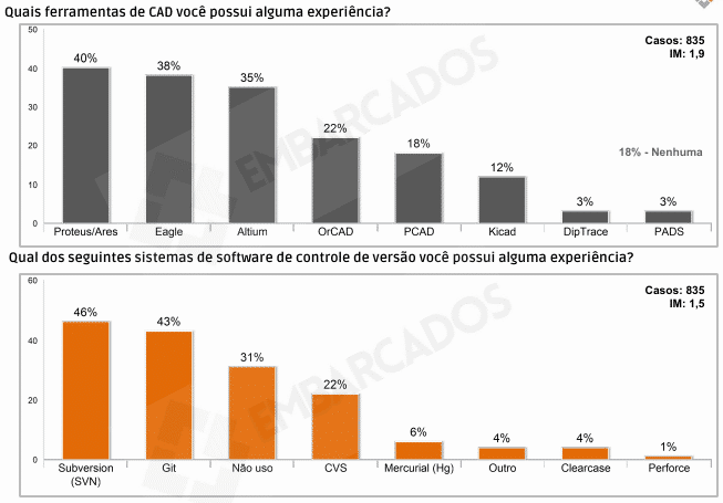 Quanto ao desenvolvimento de hardware, podemos considerar que existe uma preferência por Proteus/Ares, Eagle e Altium. De 35% a 40% dos profissionais possuem experiência com essas ferramentas. Outros softwares, com menor intensidade, tem atraído o profissional. 22% dos profissionais já utilizou o Orcad, 18% já possuem algum contato com PCAD e 12% possuem experiência com o Kicad.