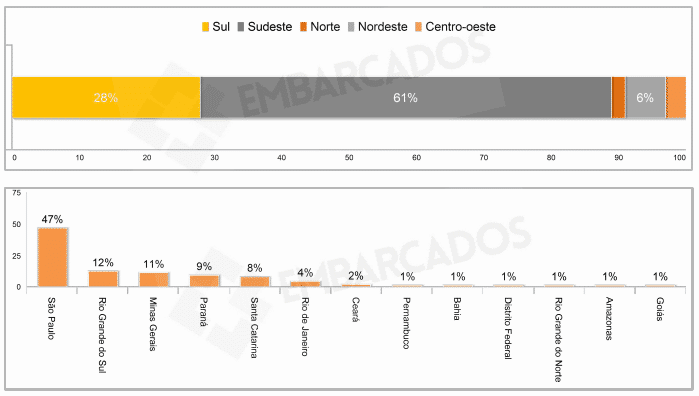 Com relação aos Estados em que residem os profissionais que responderam a pesquisa é possível observar que as Regiões Sul e Sudeste concentram a grande maioria dos profissionais da presente pesquisa. Os números foram distribuídos da seguinte forma: 61% são residentes na Região Sudeste, sendo 47% em São Paulo, 11% em Minas Gerais e somente 4% no Rio de Janeiro; a Região Sul corresponde a 28% dos profissionais da pesquisa, sendo 12% residentes no Rio Grande do Sul, 9% no Paraná e 8% em Santa Catarina; A Região Norte, Nordeste e Centro-Oeste correspondem a 11% dos profissionais que responderam a pesquisa, sendo 2% residentes no Ceará, 1% em Pernambuco, 1% na Bahia, 1% no Rio Grande do Norte, 1% no Distrito Federal, 1% em Goiás e por fim, e não menos importante, 1% no Amazonas.