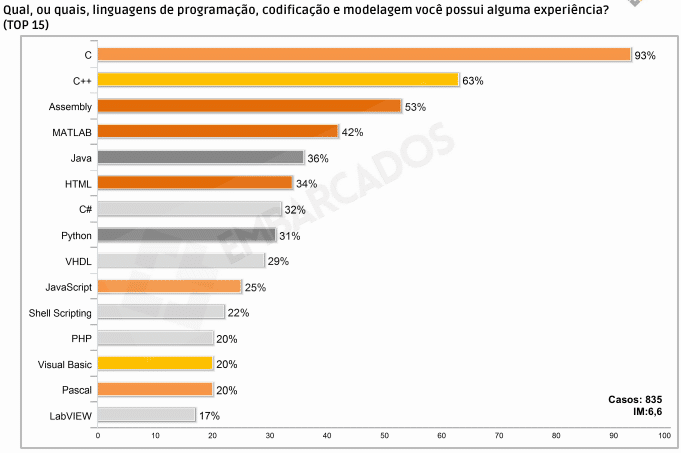 Linguagens como C++ e Assembly já eram grandes companheiras da linguagem C, e já vinham sendo adotadas em projetos, por isso que mais de 50% dos desenvolvedores já usaram tais linguagens profissionalmente. Mas o interessante agora é que o mercado tem se expandido de certa forma que outras linguagens têm assumindo papel muito importante durante o desenvolvimento de um projeto. Exemplo disso são as linguagens MATLAB, Java, HTML, C#, Python e VHDL, que já foram utilizadas por pelo menos 30% dos profissionais.