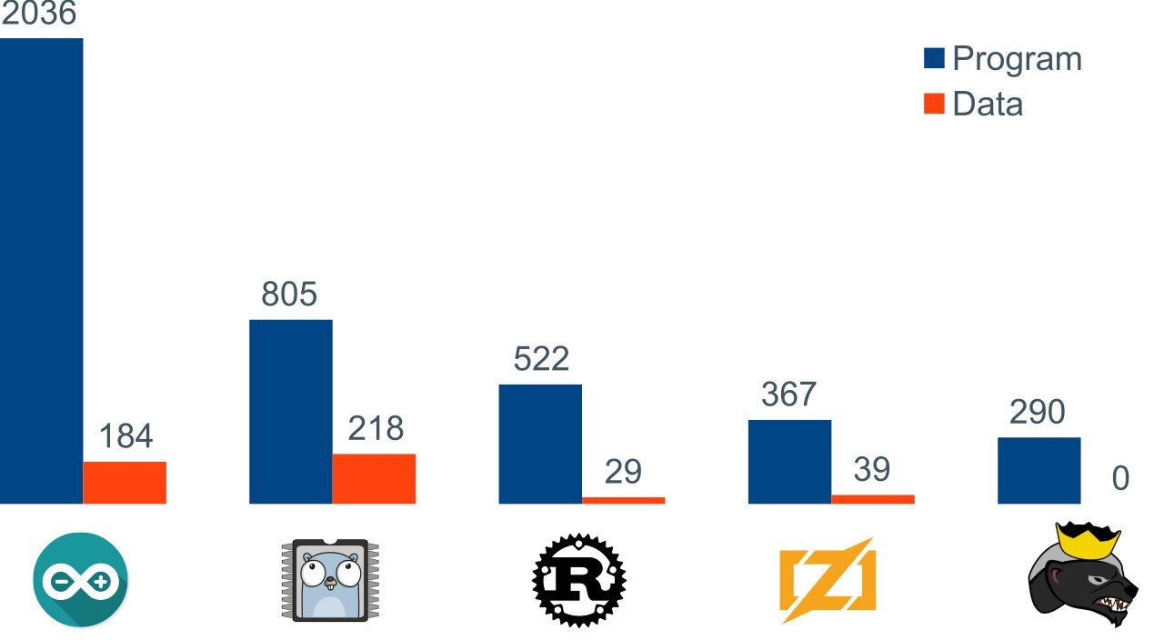 - Espruino: Espruino utiliza um motor próprio, o Espruino JavaScript, que foi customizado para dispositivos pequenos com 128kB de Flash e 8kB de RAM;