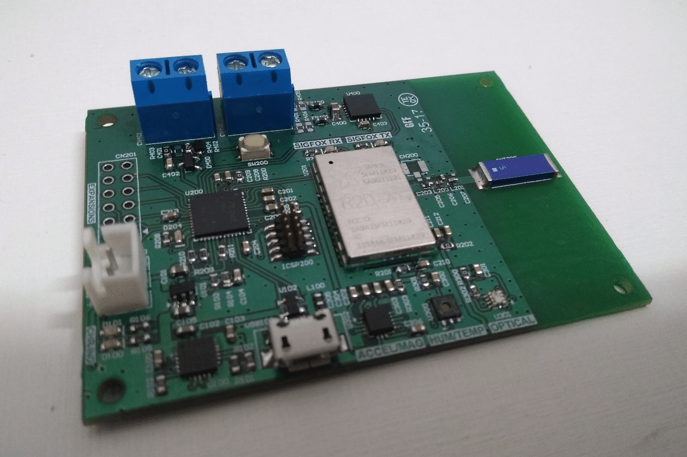 A placa pode ser facilmente testada com programas exemplos fornecidos pelo fabricante, assim você pode validar o uso dos sensores junto à rede Sigfox e usá-los na sua solução. A figura a seguir exibe a placa: